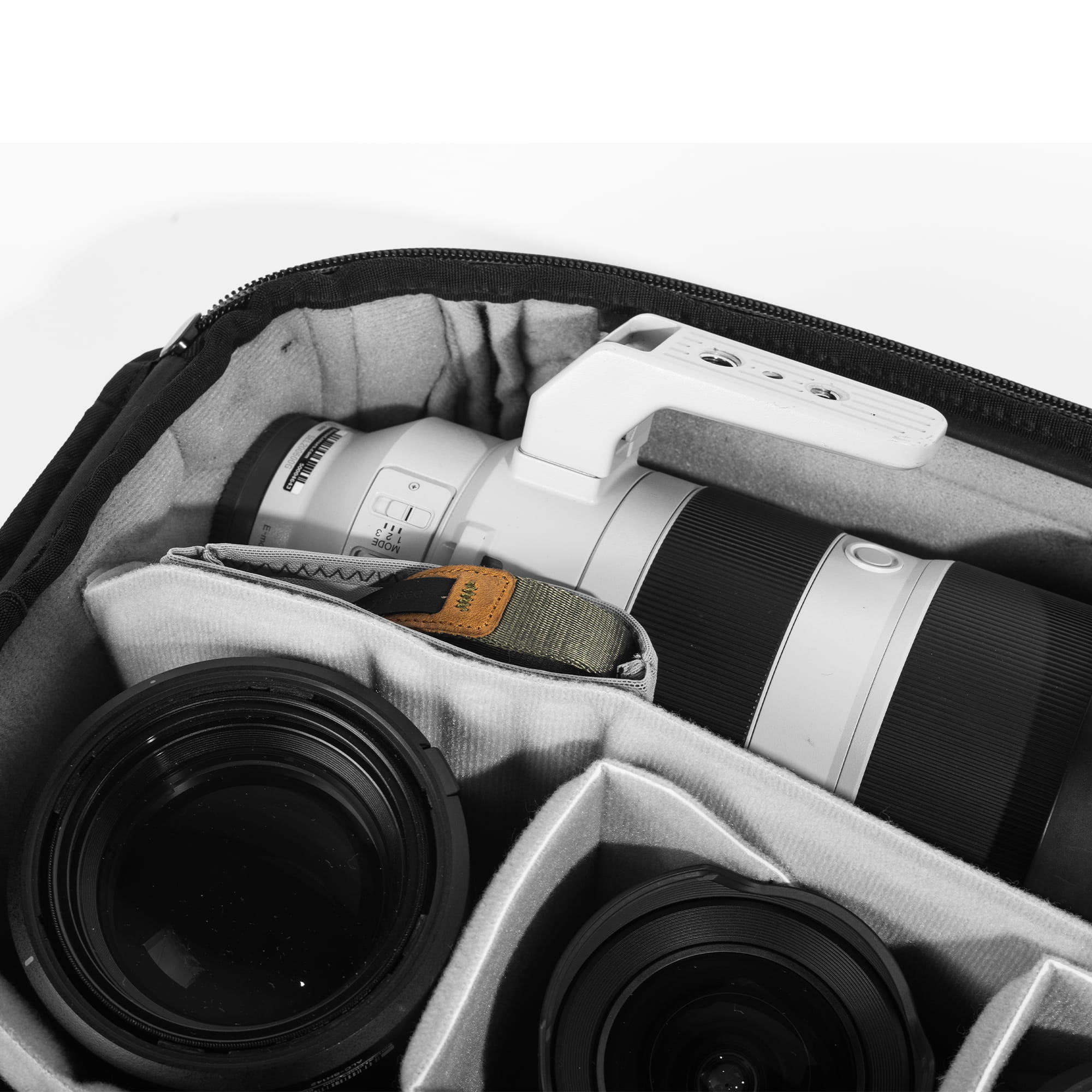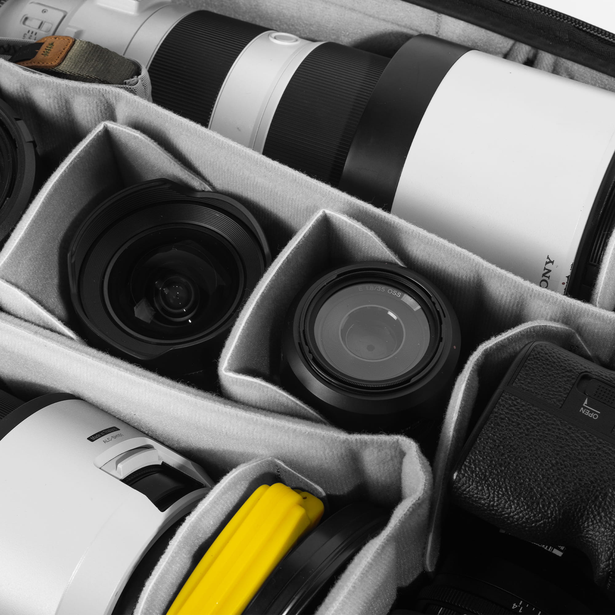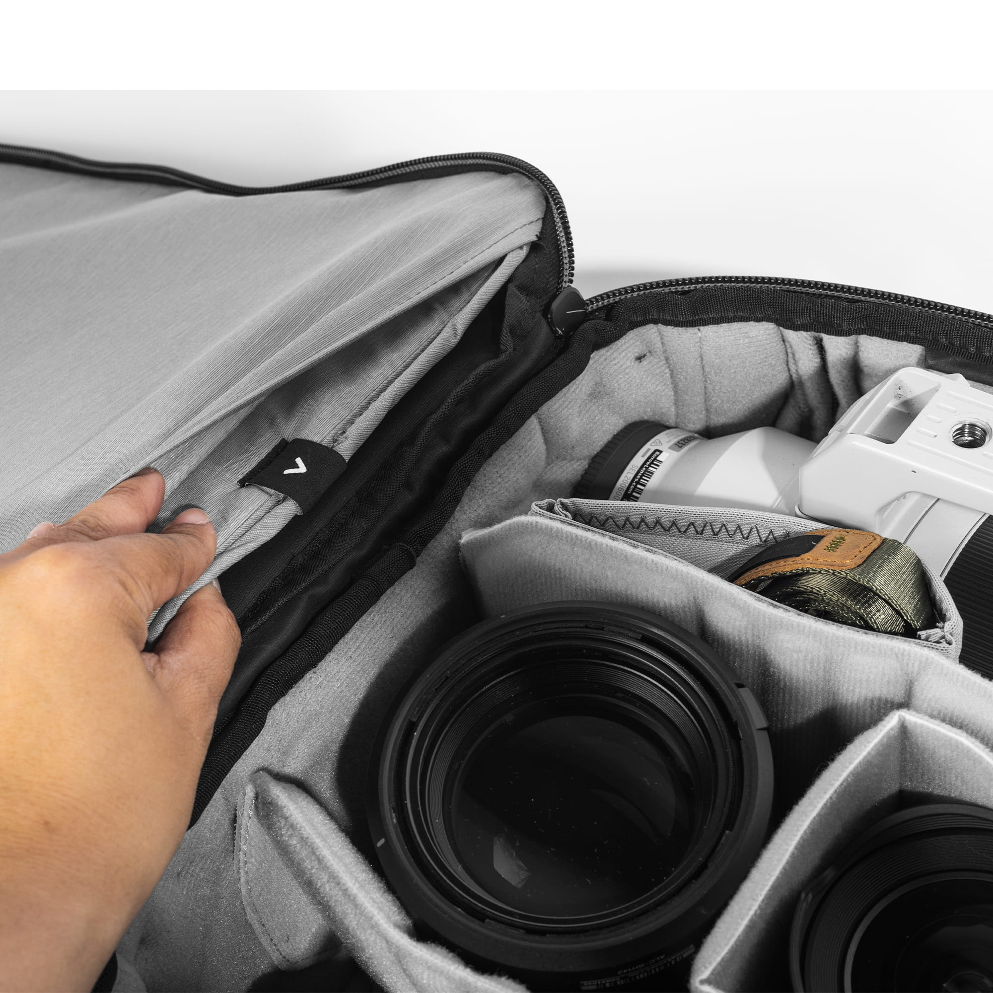 Der große Camera Cube bietet selbst der Profi-Ausrüstung für alle Anwendungsbereiche Platz. Mit 10 frei konfigurierbaren, unterschiedlich langen Klett-Einteilern kannst du den Platz extrem flexibel einstellen und für verschieden große Objektive, Drohnen, Analoge Kameras, Videozubehör maßgeschneidert anpassen. Peak Design hat ihn zum Beispiel mit zwei kompletten Vollformat-Ausrüstungen bestückt - mit einem Supertelezoom, einem 70-200mm 2.8er-Tele, zwei Bodies und drei Festbrennweiten. Zwei der Klett-Teiler können zum Regalboden gefaltet werden. Ideal, um den Platz voll auszunutzen - kleinere Festbrennweiten oder Zubehör kannst du auf diese Art sogar stapeln. Und auch an Kleinteile wie Objektivdeckel, Akkus und Kabel ist gedacht: Sie können in die Floating Pocket, ein bewegliches Netzfach. Genau wie die Einteiler auch kannst du es überall im Würfel festhalten - perfekt auch als Einsteckfach für Speicherkarten.