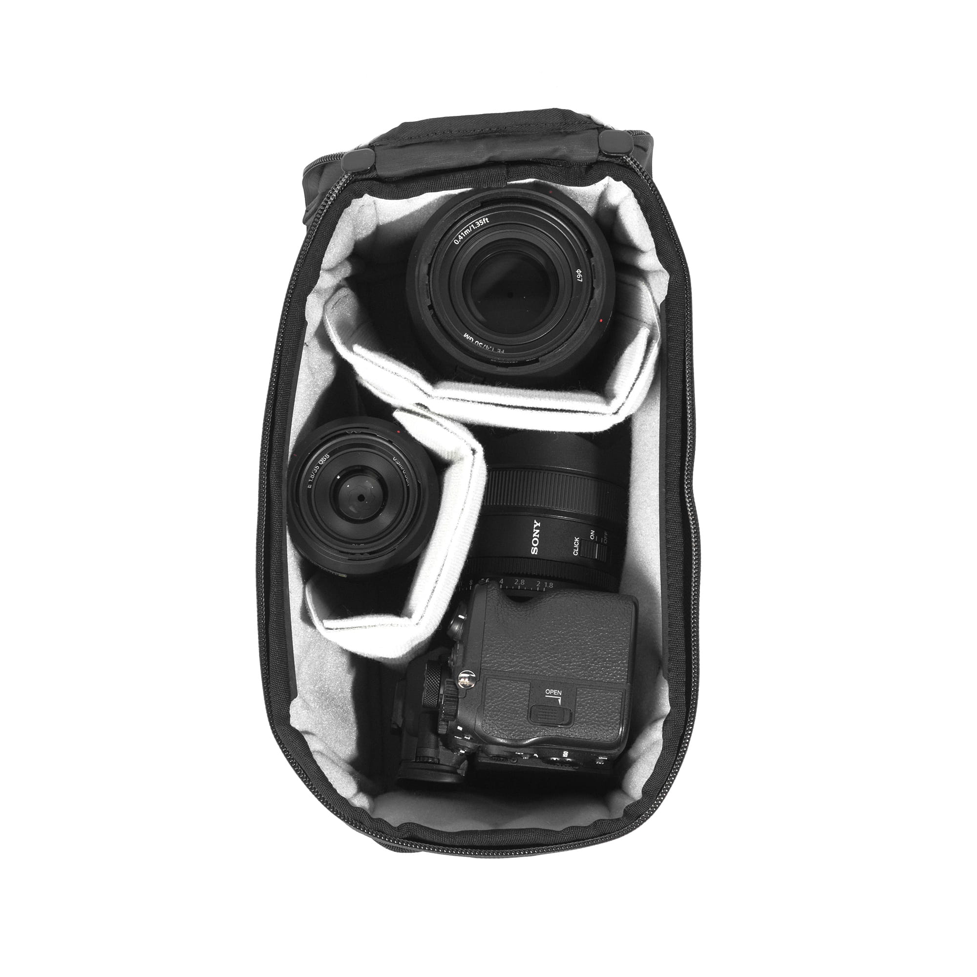 Ausgestattet mit zwei FlexFold Falteinteilern, ist dieser Würfel passend für eine Drohnenausrüstung oder eine Vollformat-Systemkamera mit zwei Festbrennweiten. Bei APS C - Systemen sogar drei). Ein größerer DSLR-Body mit Standardobjektiv passt ebenfalls. Einer der beiden Teiler kann zum Regalboden gefaltet werden. Ideal, um den Platz voll auszunutzen - kleinere Festbrennweiten oder Zubehör kannst du auf diese Art sogar stapeln. Du kannst die FlexFold-Teiler natürlich auch ganz entfernen und die Tasche dann zum Beispiel für ein einzelnes großes Zoomobjektiv verwenden. Mit mehreren verschiedenen Cubes kannst du deinen Travel Backpack individueller anpassen als jedes andere Packsystem. Etwa zusammen mit einem Packing Cube und einem Shoe Pouch für Kleidung, Reisegepäck oder weiteren Camera Cubes.