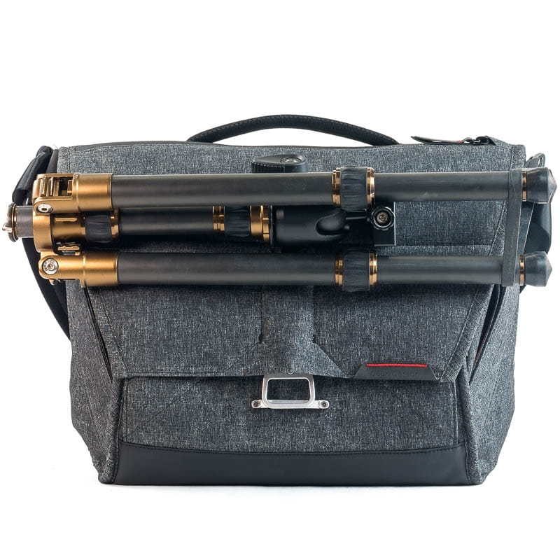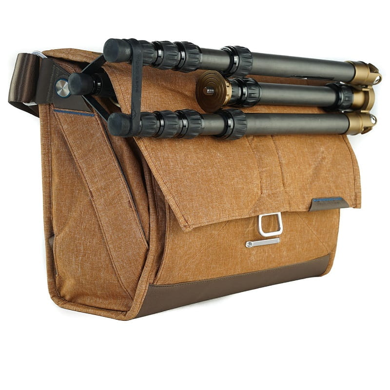 Die Every-Day-Messenger-Taschen verfügen unter der Deckelklappe über einen 34 cmlangen Tunnel durch welches eines der Stativbeine geführt werden kann. Die anderen Beine liegen auf derDeckelklappe auf. Damit das Stativ nicht aus dem Tunnel rutschen kann, werden die Stativbeine mitdem Gummiband zusammengehalten. Außerdem klappt das Stativ so auch nicht von selbst auf.
