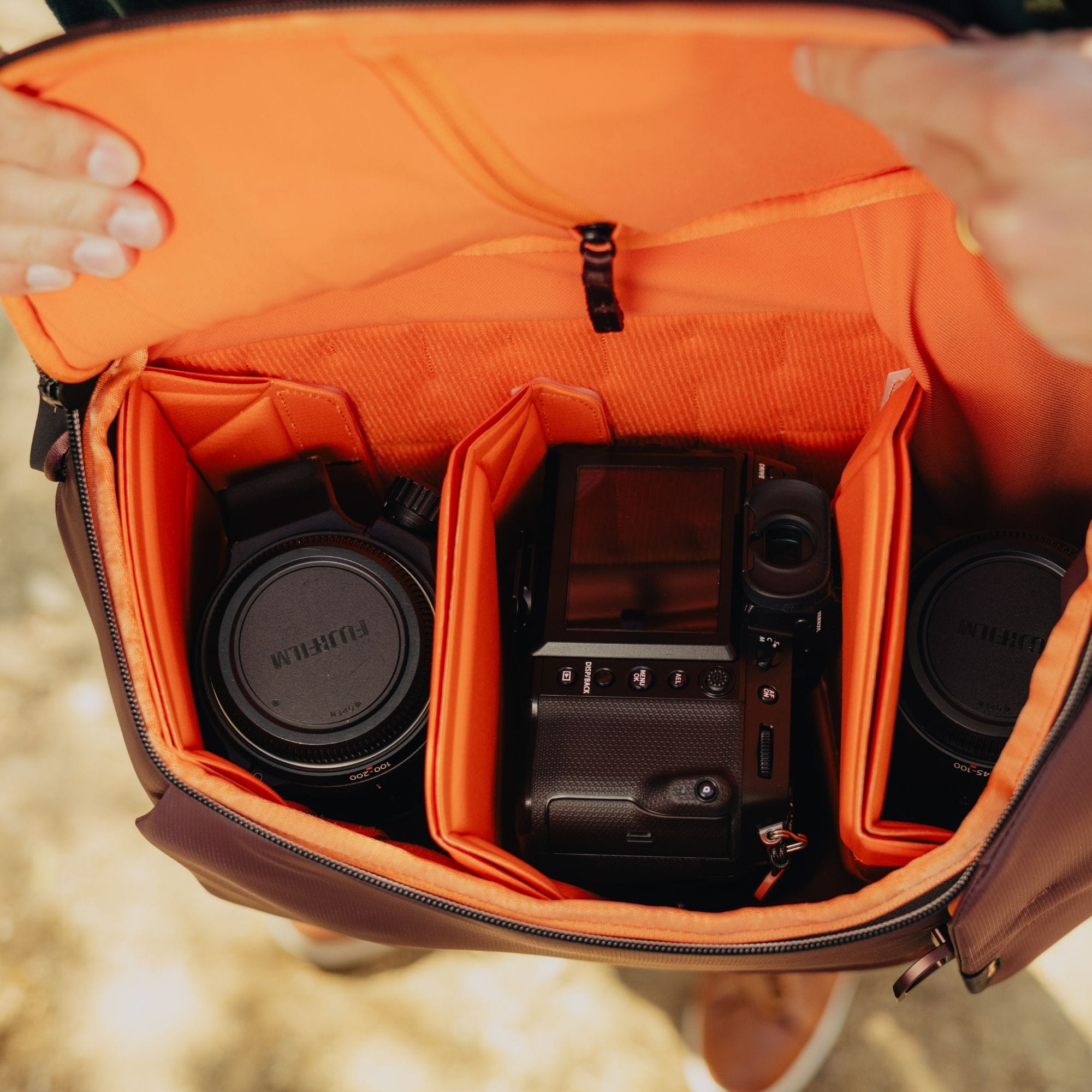 Dank zusätzlicher seitlicher Reißverschlüsse erreichst du deine Kamera, ohne den ganzen Rucksack öffnen zu müssen. So bleibt deine Ausrüstung jederzeit griffbereit – egal ob du spontan ein Motiv entdeckst oder schnell das Objektiv wechseln willst. Gleichzeitig kannst du Foto- und Alltagsgegenstände getrennt verstauen und gezielt darauf zugreifen.