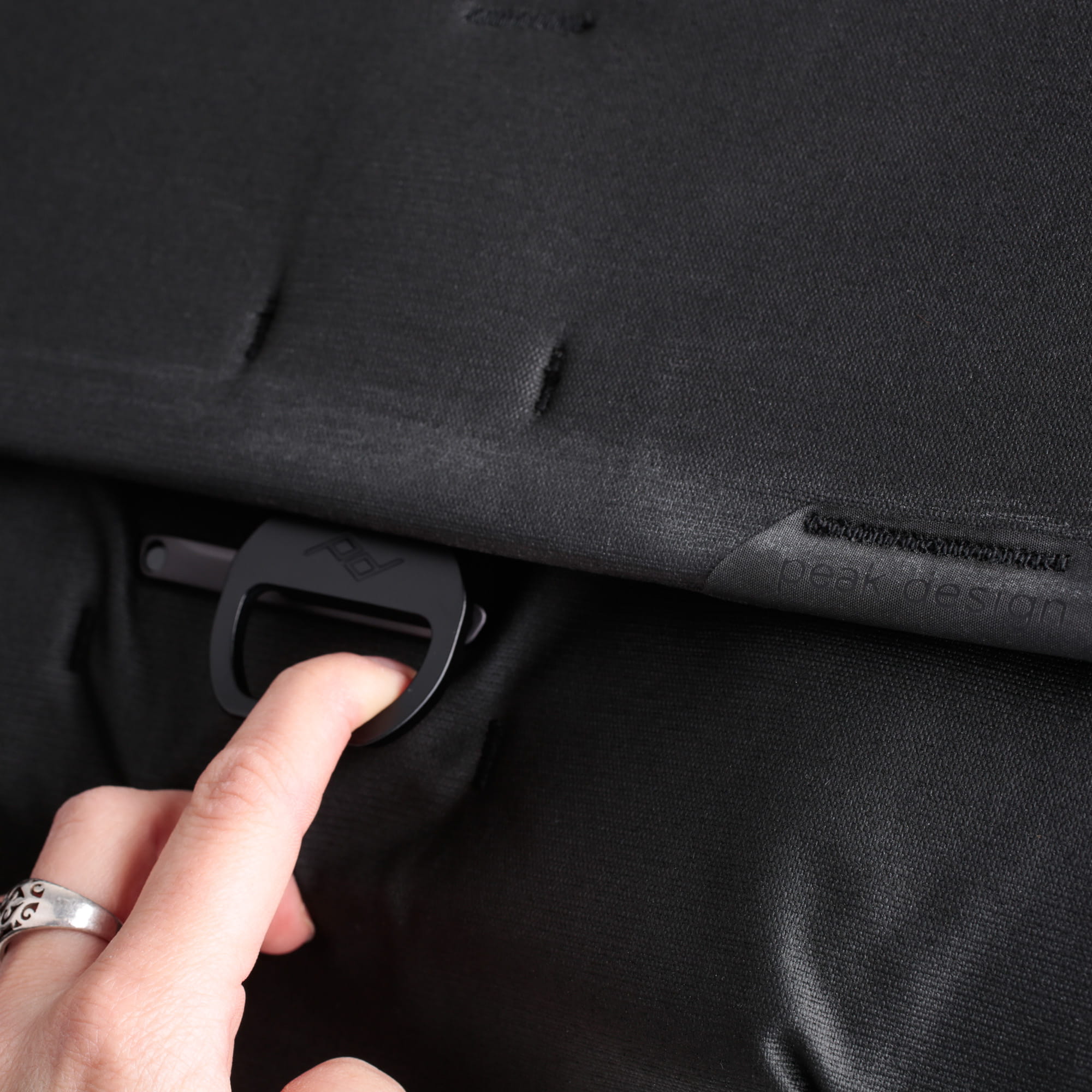 Eine Besonderheit ist der extrem erweiterbare Innenraum. Möglich wird das über eine speziell designte, verstellbare Deckelklappe. Dazu hat Peak Design das innovative MagLatch-Verschlusssystem entwickelt und eine hervorragend durchdachte, besonders flexible Lösung für effektiven Schutz geschaffen, die sich auch bei den Fotoucksäcken bewährt hat. In der Verschlussklappe ist ein Verschlusshaken aus Metall mit passenden magnetischen Ankerbalken an der Vorderseite. Anders als bei den meisten Taschen wächst oder verkleinert sich der Innenraum somit nach Bedarf, je nachdem auf welcher Höhe der Verschlusshaken eingerastet wird. Das Volumen der Everyday Messenger vergrößert sich dank dieser Technik um 3 Liter - so anpassungsfähig ist wohl kaum eine Fototasche auf dem Markt.