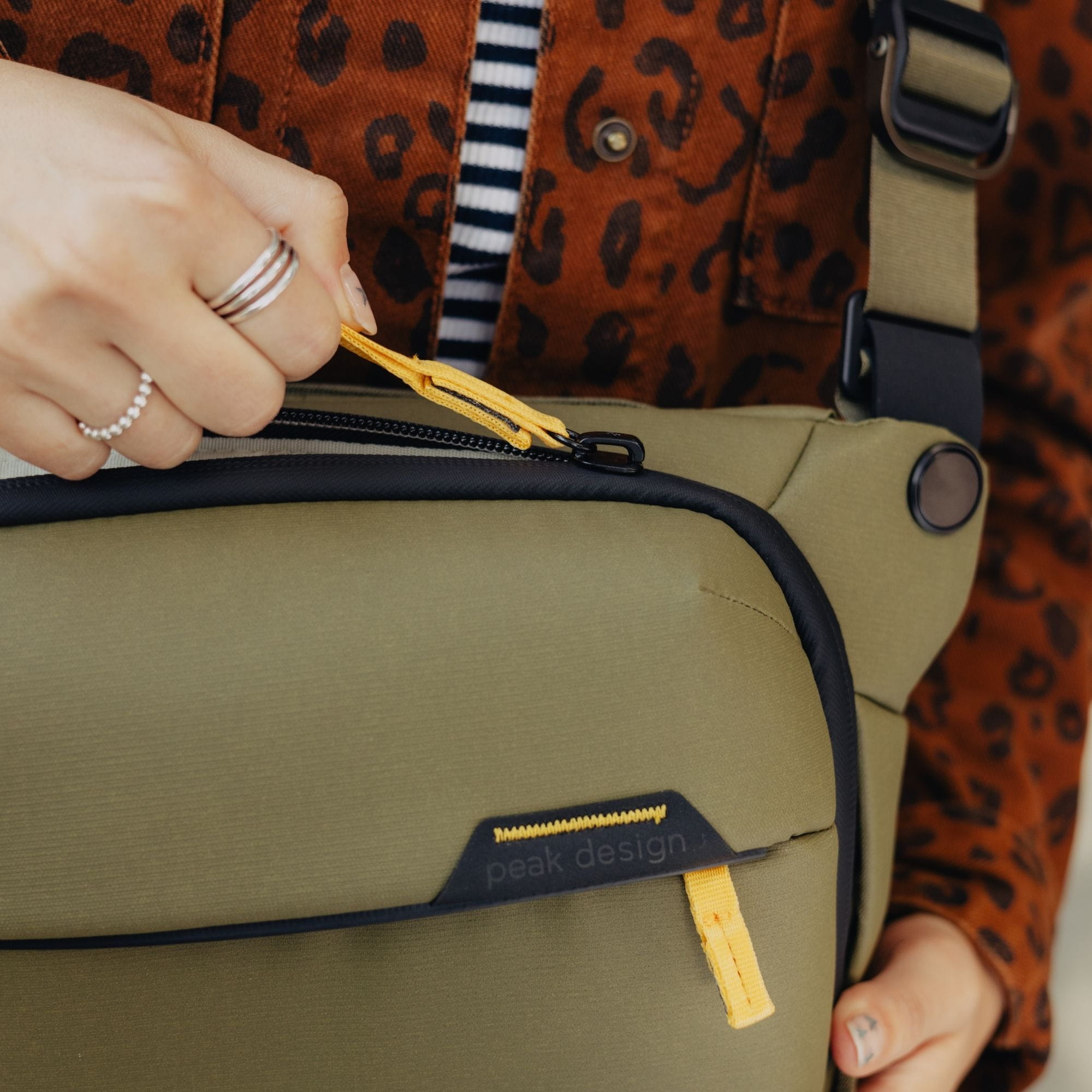 Die aus robustem, wasserfestem Nylon gefertigte Tasche kann auf unterschiedliche Art getragen werden. Als Umhängetasche passt sich die Everyday Sling 3L bequem dem Körper an. Ein gepolsterter Schultergurt mit Drehgelenken sorgt für einen optimalen Sitz, die Länge kann zusätzlich mit dem bewährten Peak-Design-Schnellverschluss beliebig angepasst werden. Dank eines schicken Karabiner-Clips aus eloxiertem Aluminum kann der gepolsterte Teil des Tragegurts geöffnet und vom Schultergurt getrennt werden. Sicher in der Halteöse eingeklinkt, wird die Tasche so im Handumdrehen zur Hüfttasche, die Gurtenden werden im Futteral verstaut.