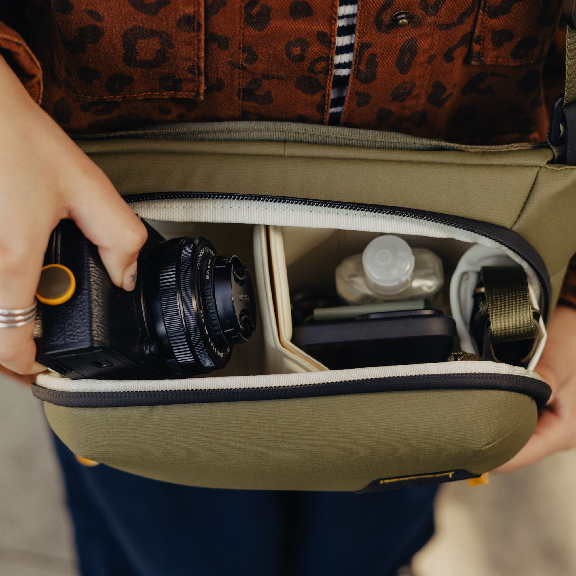 Die Everyday Sling in neuer, besonders kompakter Version. Perfekt für eine minimale Kameraausrüstung aus einer DSLM mit ein bis zwei Objektiven. Mit verstellbarem Gurt - sitzt sowohl als Hüft- oder Umhängetasche optimal.