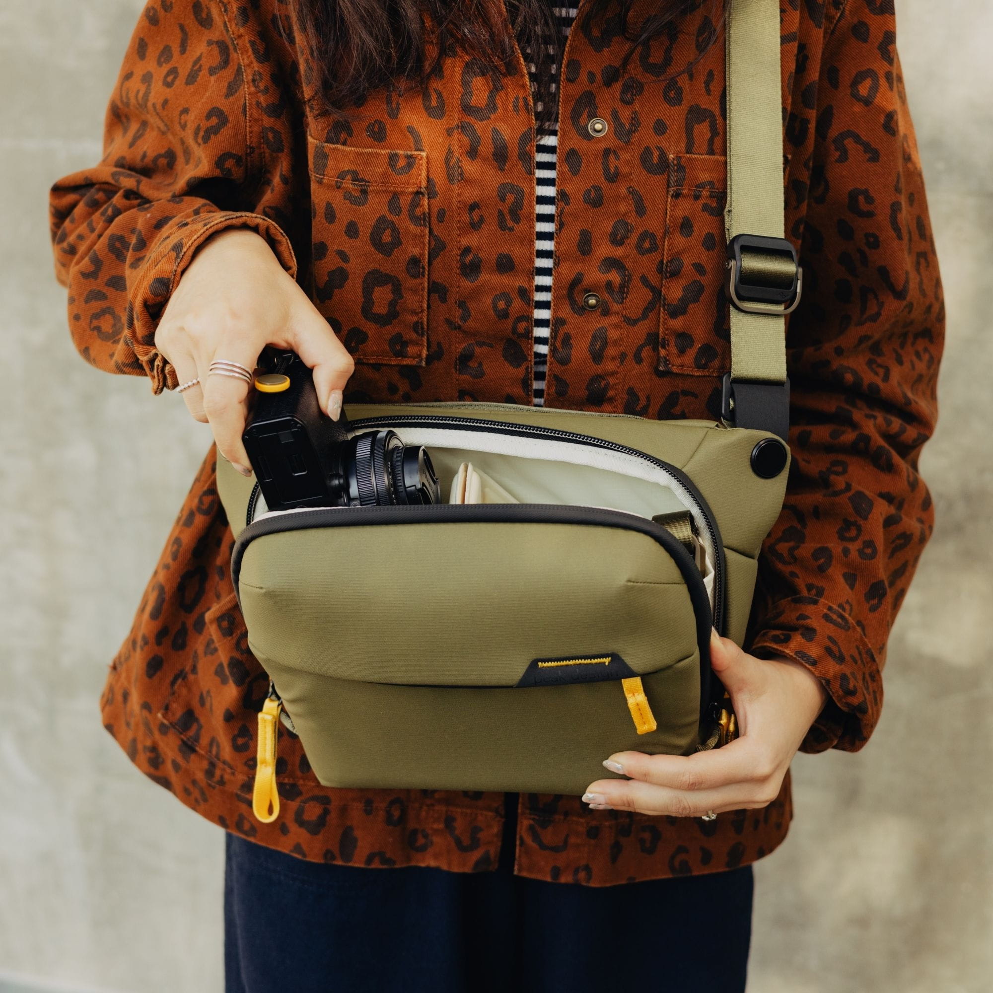 Das Design der Tasche setzt auf ein geräumiges Hauptfach, welches Platz für kompakte Kameras bietet: Entweder eine kleine Spiegelreflex mit Festbrennweite oder eine DSLM mit Objektiv und einer weiteren Festbrennweite. Für APSC-Kameras ist die Tasche perfekt, durch die FlexFold-Teiler können sogar zwei kleine Festbrennweiten in der Everyday Sling 3L gestapelt werden. Alternativ kannst du den Teiler auch ganz entfernen und dafür eine Kamera mit längerem Objektiv in der Tasche transportieren. An der Innenseite der Deckelklappe ist ein kleines, längliches Fach - besonders praktisch, um Kabel oder die Cord-Hook-Haltegurte zu verstauen. Natürlich gibt es auch noch ein Einsteckfach an der Außenseite, hier können Dinge wie dein Smartphone oder eine Brieftasche aufbewahrt werden.