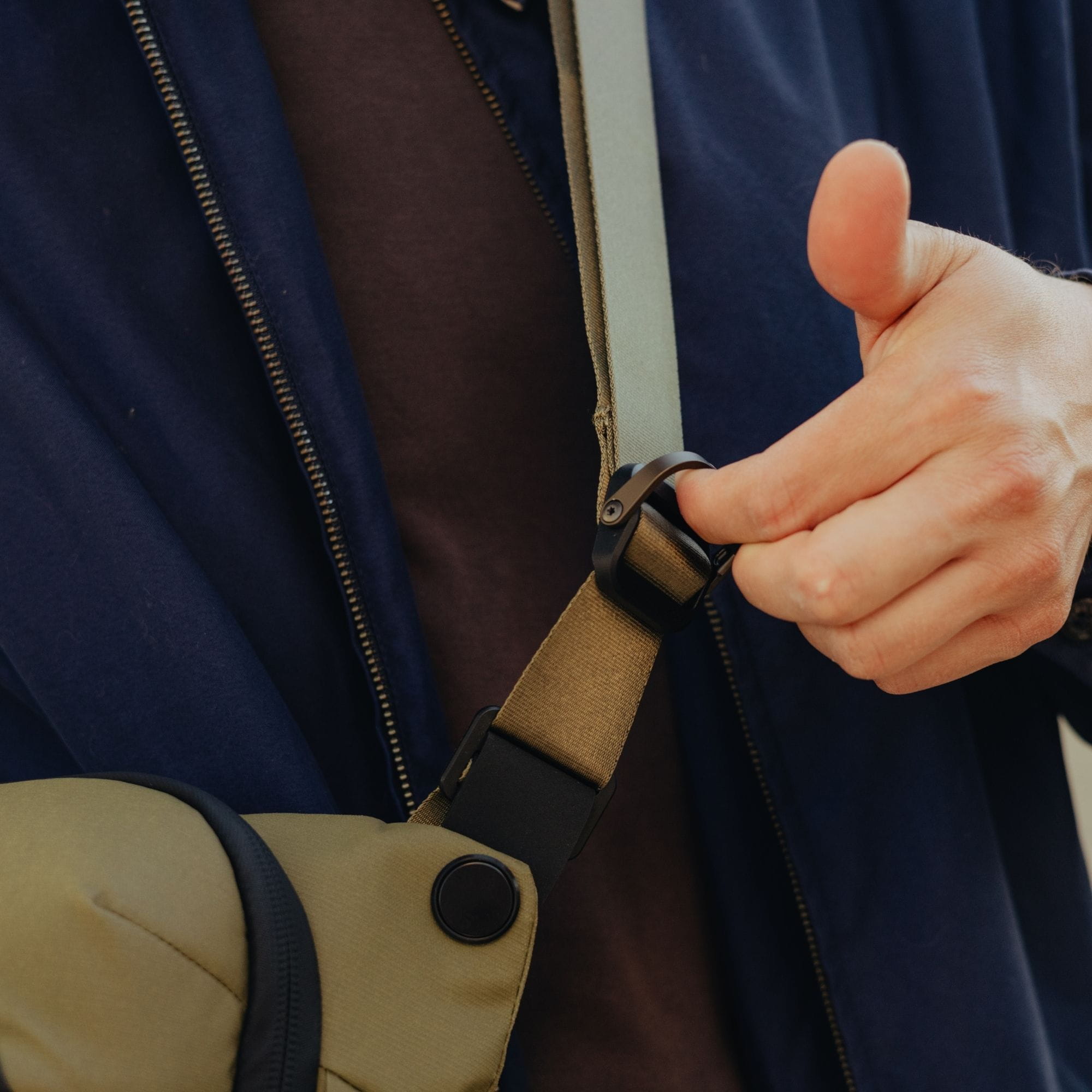 Die aus robustem, wasserfestem Nylon gefertigte Tasche kann auf unterschiedliche Art getragen werden. Als Umhängetasche passt sich die Everyday Sling 6L bequem dem Körper an. Ein gepolsterter Schultergurt mit Drehgelenken sorgt für einen optimalen Sitz, die Länge kann zusätzlich mit dem bewährten Peak-Design-Schnellverschluss beliebig angepasst werden. Dank eines schicken Karabiner-Clips aus eloxiertem Aluminum kann der gepolsterte Teil des Tragegurts geöffnet und vom Schultergurt getrennt werden. Sicher in der Halteöse eingeklinkt, wird die Tasche so im Handumdrehen zur Hüfttasche, die Gurtenden werden im Futteral verstaut.