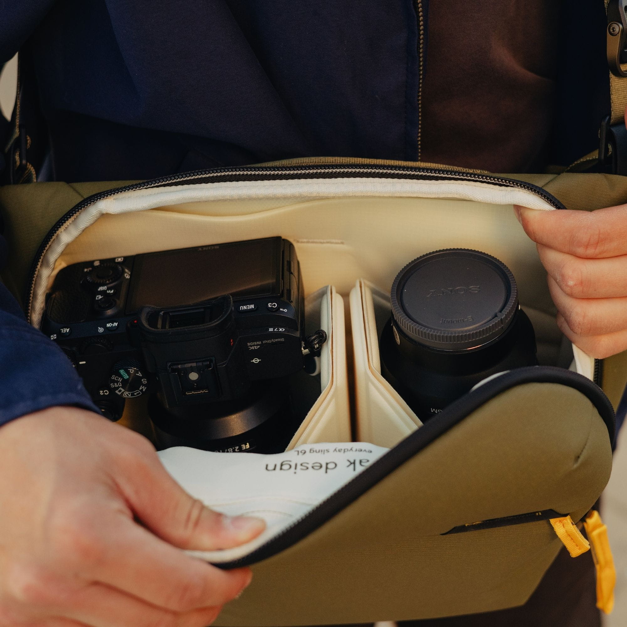 Fast schon ein Markenzeichen von Peak Design: Anders als bei anderen Taschen lassen sich die Everydays noch flexibler einteilen und anpassen. Der Clou dahinter: die FlexFold-Teiler! Die Entwickler von Peak Design haben das Konzept an japanische Origami-Techniken angelehnt. Mit diesem innovativen Design aus zwei Lagen Stoff ist der Einteiler nicht nur einfach faltbar, sondern doppelt ausklappbar: Eine Lage des Teilers lässt sich umklappen, während die andere Lage ausgeklappt bleibt. So bekommst du eine Art Regal mit einem Zwischenboden. Der Einteiler kann ein langes Objektiv stützen und gleichzeitig zwei übereinander gestapelte Objektive voneinander trennen. So ergibt sich eine Vielzahl von Verstaumöglichkeiten, was die Everyday Sling trotz ihrer kompakten Maße erstaunlich geräumig werden lässt.