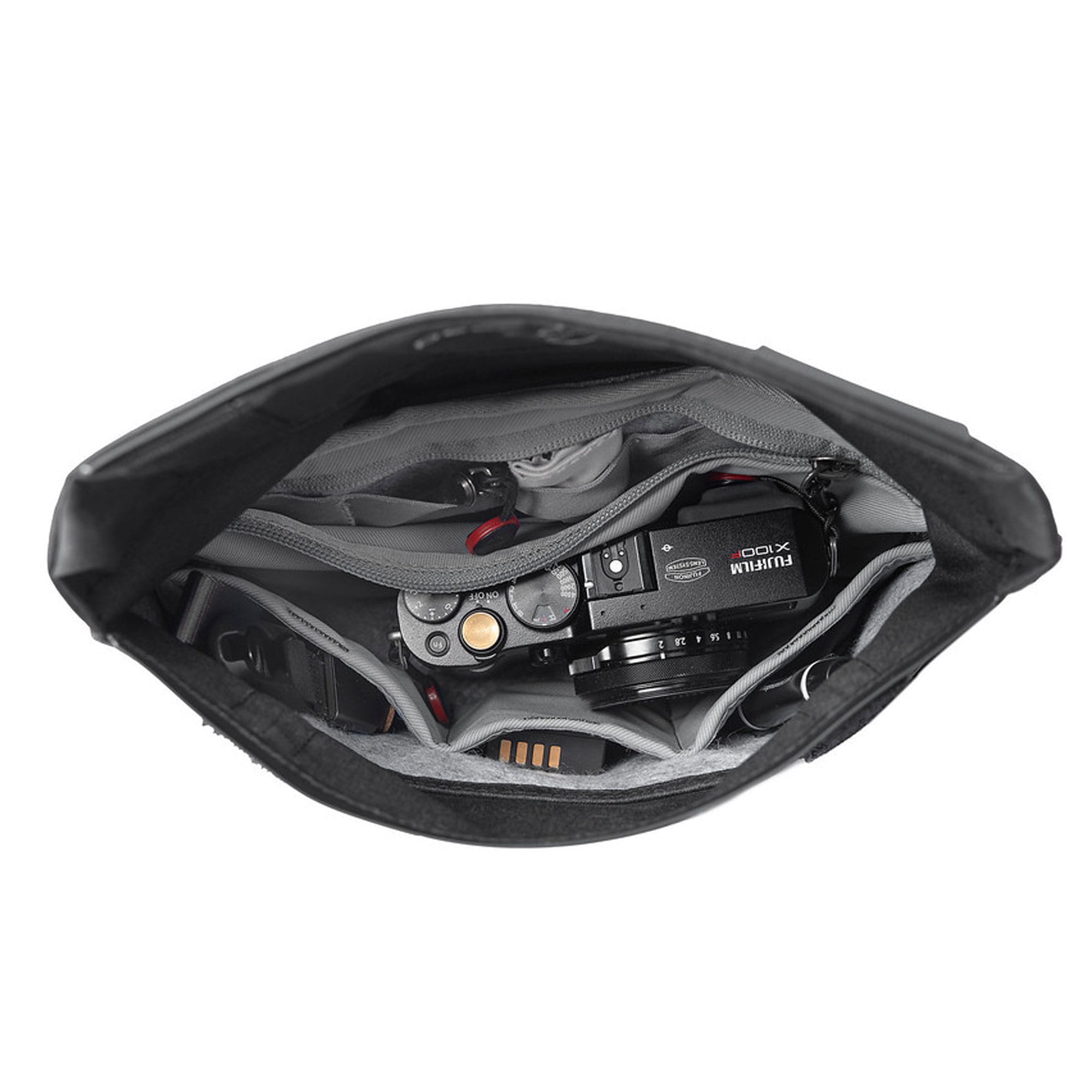 Die Field Pouch übernimmt eine clevere Designlösung von den Großen: Den Innenraum, der je nach Bedarf mit wächst. Ähnlich wie bei den Everyday Messengern oder Backpacks erweitert ein Klett-Deckel im Rolltopdesign den Innenraum von 1,5 bis maximal 3 Liter. Genug für eine APSC-DSLM-Kamera mit kurzen Objektiv, wodurch sich die Tasche zur Street-Shooting-Tasche mausert. Aber statt der Kamera würde auch ein Tablet Platz finden. Dank des mitgelieferten Tragegurts hast du eine kompakte Umhängetasche, die sofort einsatzbereit ist.