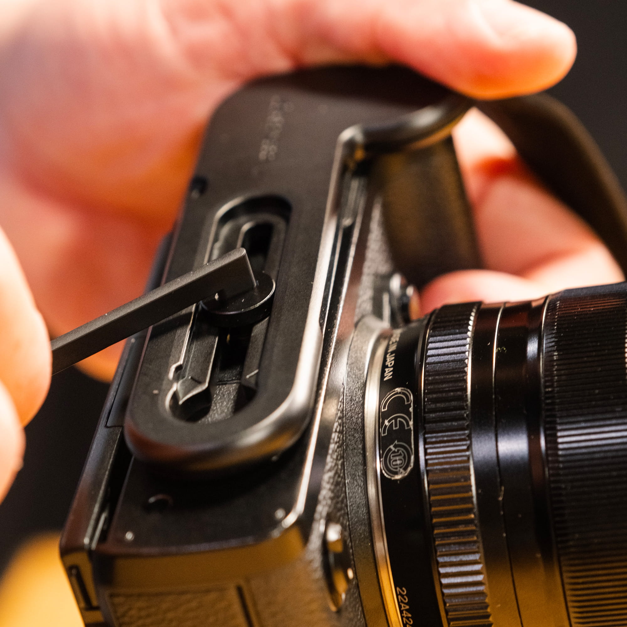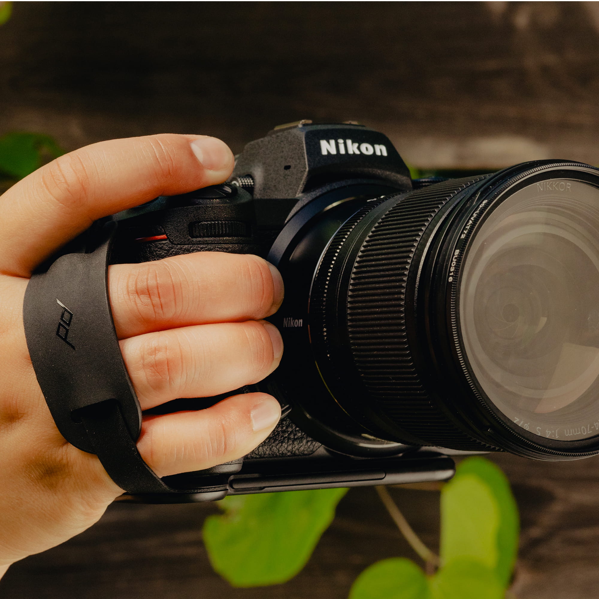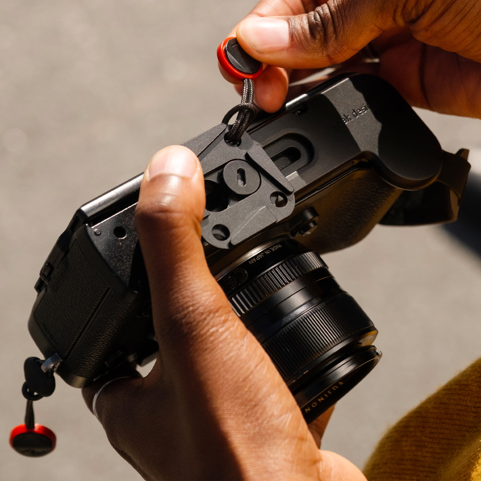 Die Griffschlaufe aus hochreißfestem Hypalon ist fest an der Bodenplatte verankert, aber beweglich gelagert, um sich perfekt an deinen Griff anzupassen. Außerdem ist sie wie eine Gürtelschnalle individuell einstellbar. Je nach Handgröße und Griff-Gewohnheit bietet sie bequemen Halt, um die Kamera im Zwei- oder Drei-Finger-Griff zu führen. Oben wird die Schnalle durch den Splintring an der Kameraoberseite geführt, Ringe und Einführhilfe liegen bei.