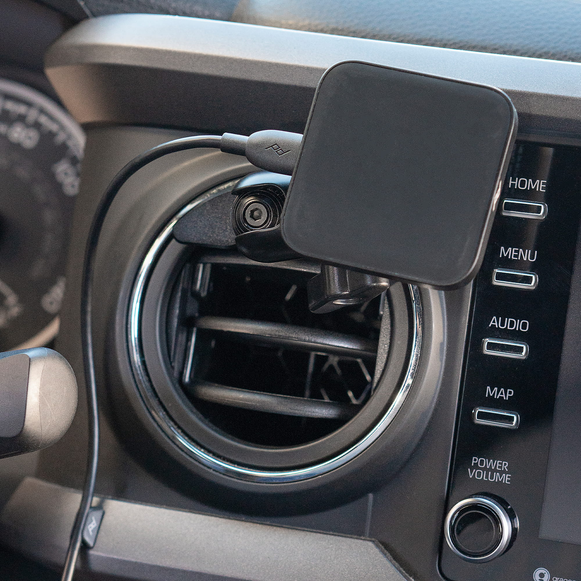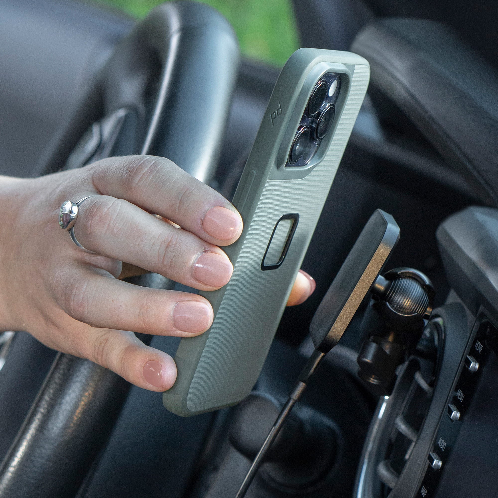 Die V2-Version unterstützt den neuesten Ladestandard von Apple, Qi2. Mit dem Update sind erstmals die vollen 15 Watt Ladestrom verfügbar - und Peak Design damit das erste Ökosystem, das geräteübergreifend damit arbeitet (ab iPhone 13 oder neuer). Du musst den Charging Ball Mount Adapter nur per USB-Kabel mit deinem Auto verbinden und dein Smartphone auf die Halterung legen. Die Übertragung zwischen Smartphone und Halterung erfolgt kabellos und ist neben den Peak-Design-Mobile-Cases auch mit MagSafe-Zubehör möglich.